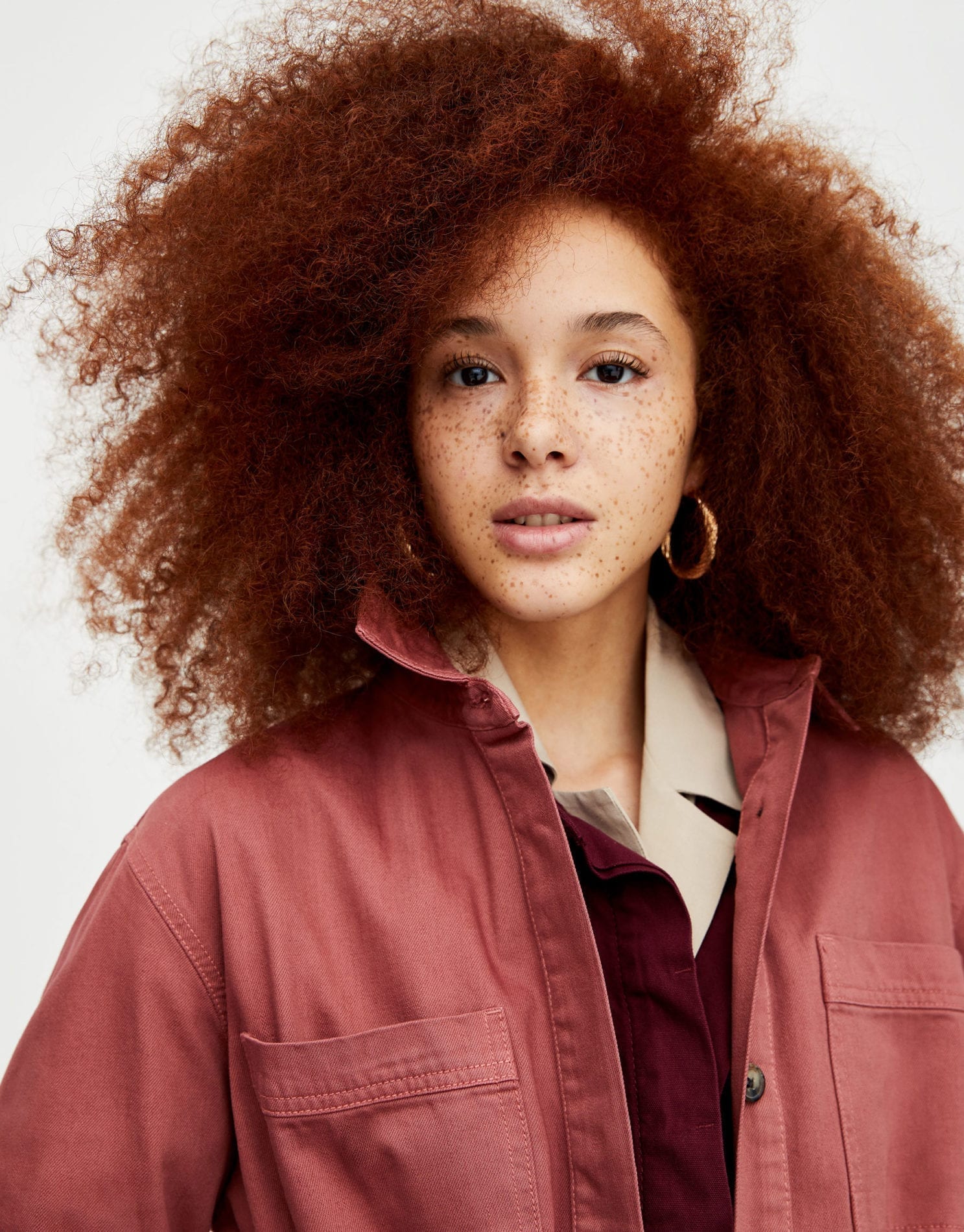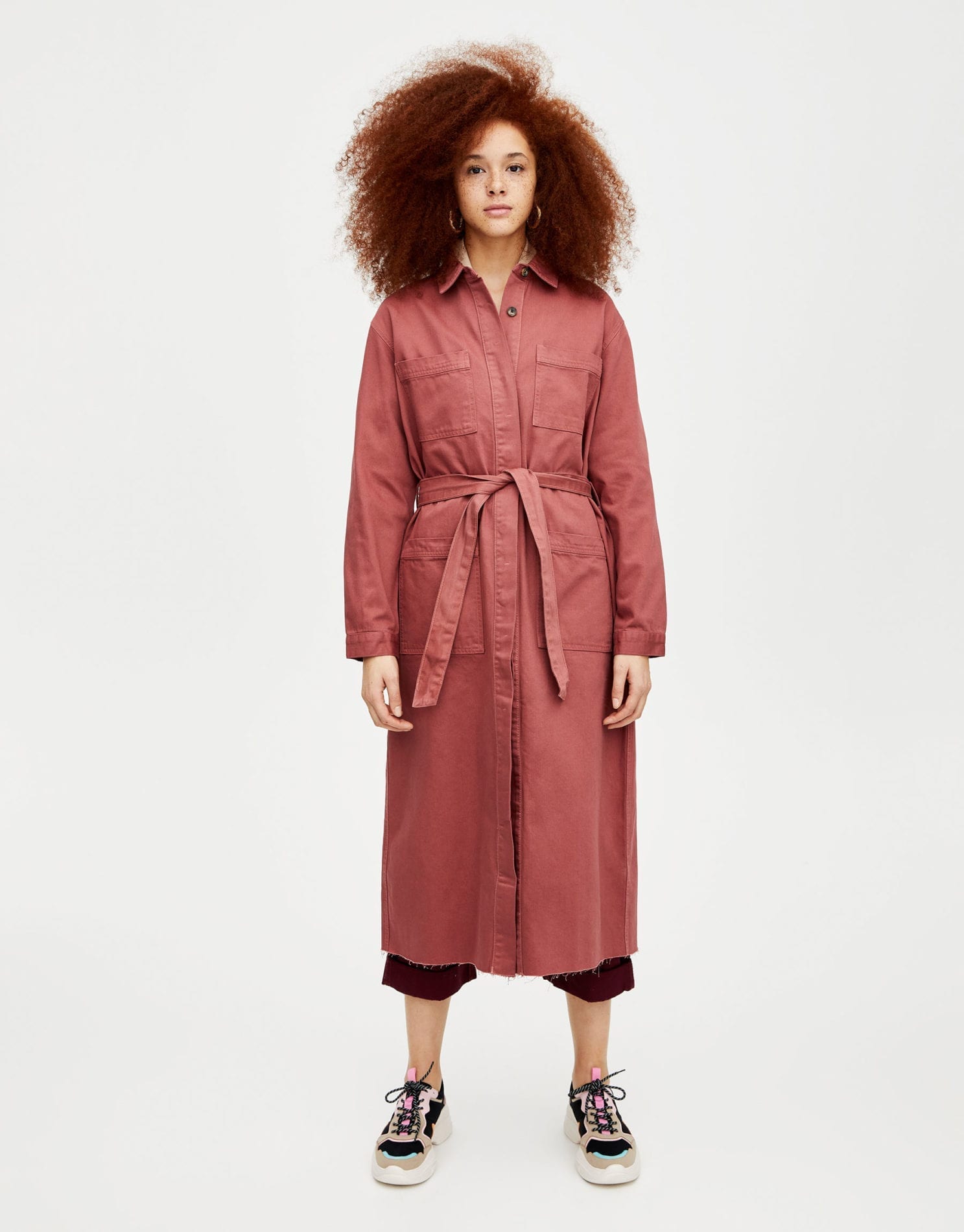 Long russet denim trench coat with a belt in matching fabric, four pockets and button fastening.